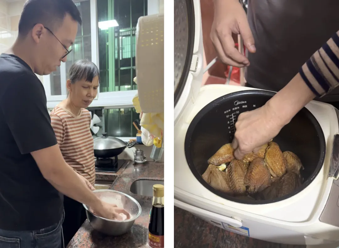 为了采集影像素材,我们鼓励曾嘉兴周末跟着妈妈学做豉油鸡翅,同时记录下来。收到视频素材时,我们看到一个已经成为父亲的大男孩,站在电饭锅前用筷子笨拙地给锅里的鸡翅逐一翻面。